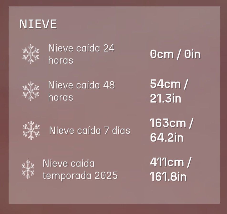 Статистика снежного покрова на курорте Valle Nevado (сентябрь 2025 года). За два дня выпало 54 см снега, за семь дней — 163 см, за весь сезон — 411 см. Источник: vallenevado.com