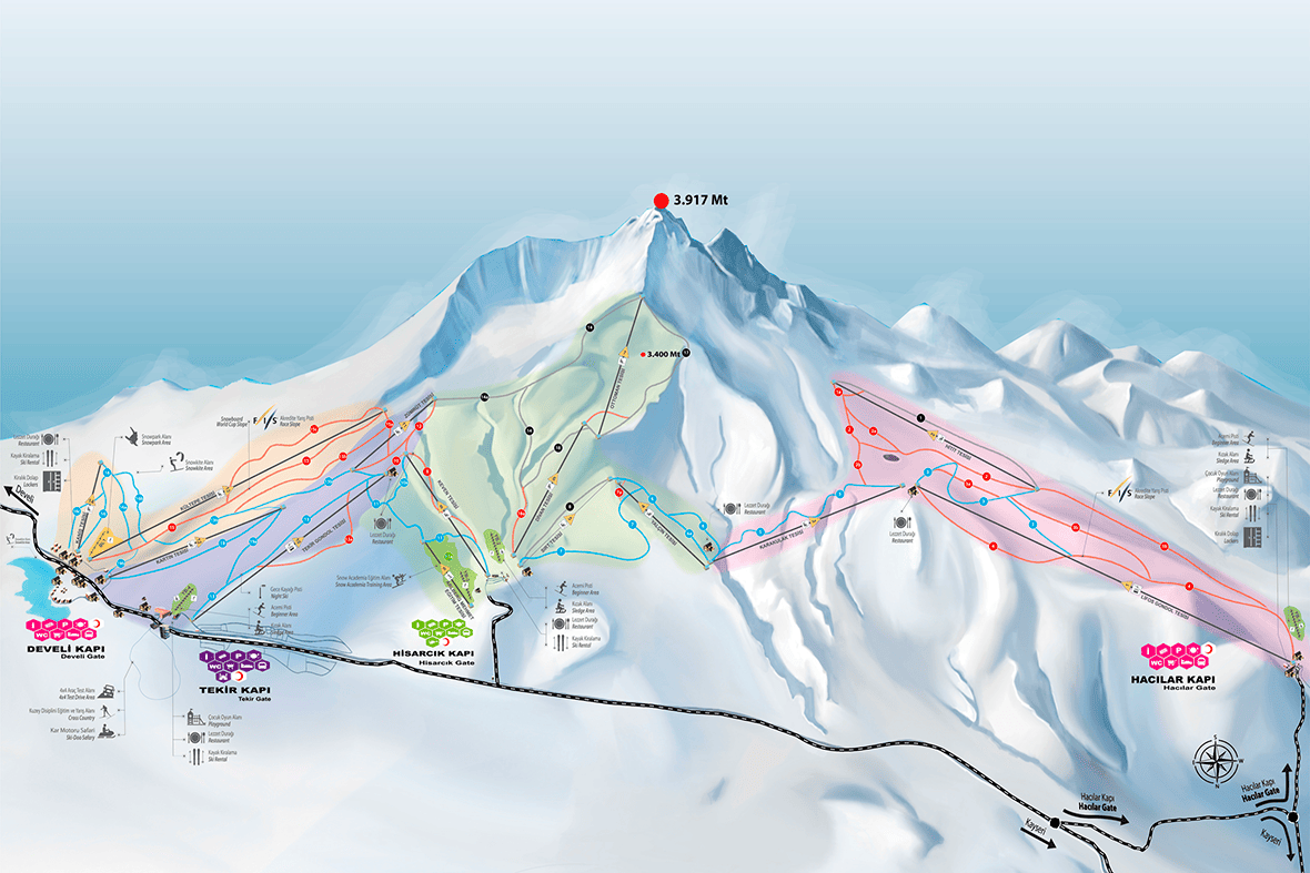 Схема курорта Эрджиес. Текир — оранжевая, Девели — фиолетовая, Хисарчик — зелёная, Хасилар — розовая. Источник: erciyeskayakmerkezi.com