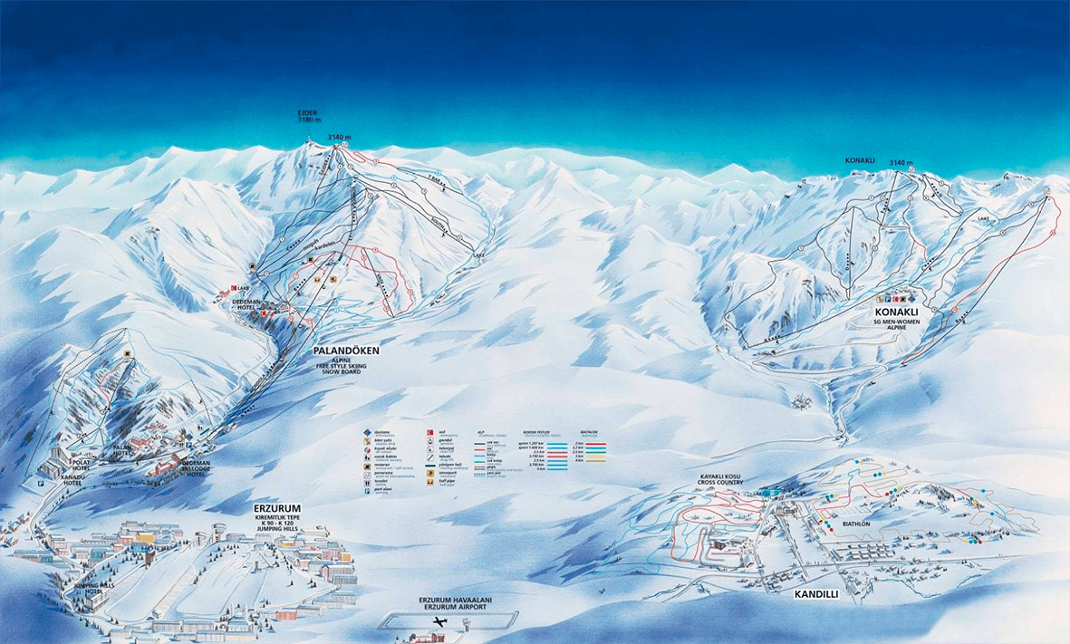 Где жить. Отели на нижних станциях канатной дороги есть как в Паландокене, так и в Конаклы. Можно жить в гостинице формата ski-in / ski-out и выходить сразу на склон, но цены на аренду в таких отелях выше, чем в Эрзуруме. В городе шире выбор жилья, вечерних развлечений и ресторанов.