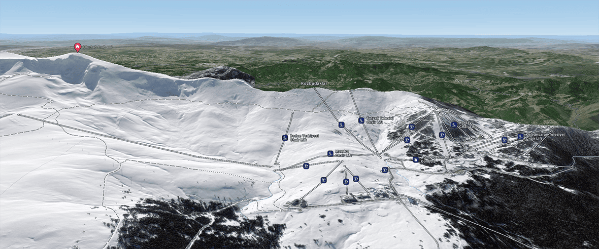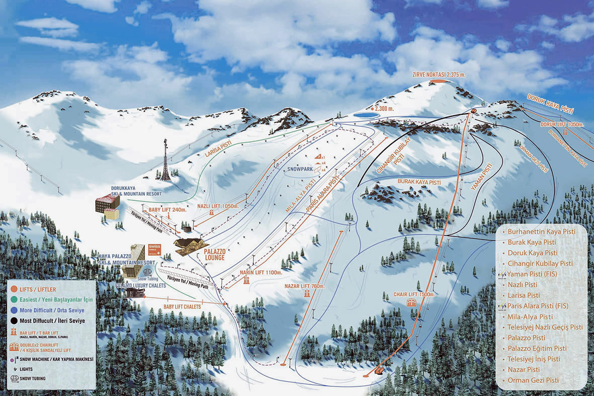 Где кататься. На курорте две зоны катания: Картал и Дорук. Обе небольшие и находятся рядом. Между склонами есть трассы, по которым можно переехать из одной зоны в другую. В Картале трассы длиннее и разнообразнее, чем в Доруке, их обслуживают кресельные и бугельные подъёмники. В Доруке есть учебная трасса с названием «Лариса» и первый в стране сноу-парк, проект которого разработали австрийские инженеры. В этой зоне только бугели и беби-лифты.
