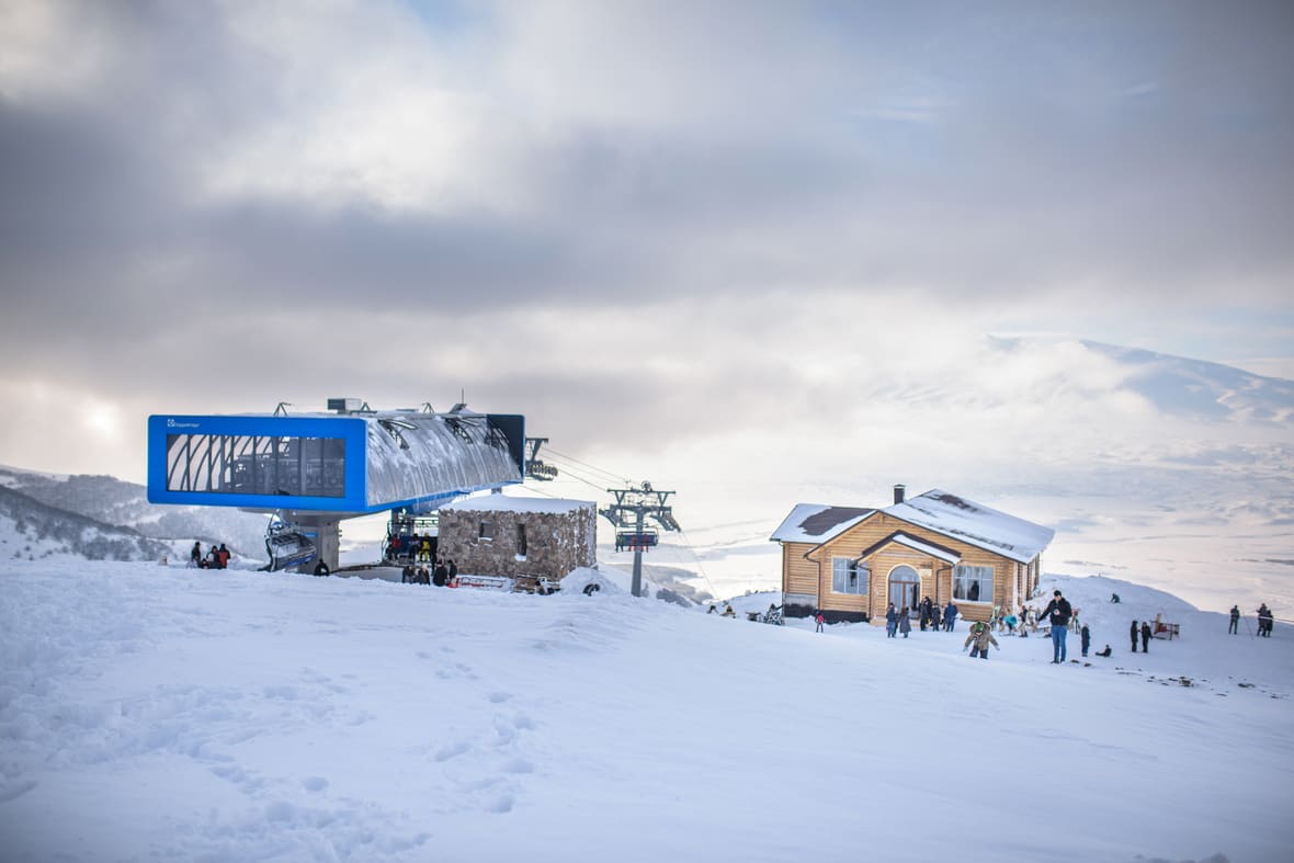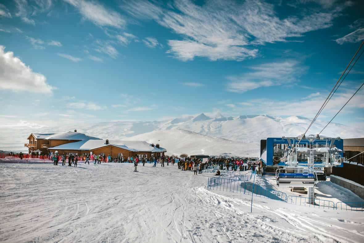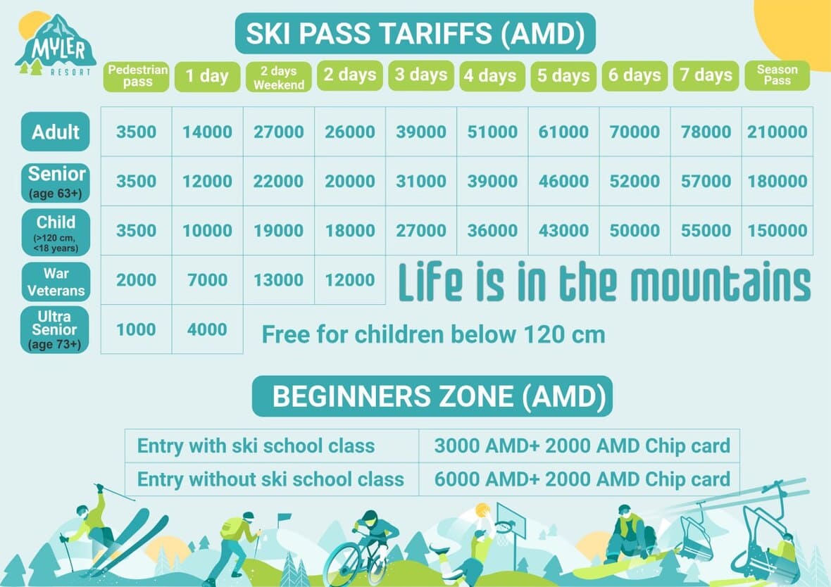 - Покупайте безлимитный тариф на один день, если не планируете задерживаться на курорте и уверены, что успеете спуститься больше четырёх раз. Подъём для взрослого стоит 3500 драмов (900 рублей), а день катания без ограничений количества подъёмов — 14 000 драмов (3600 рублей).