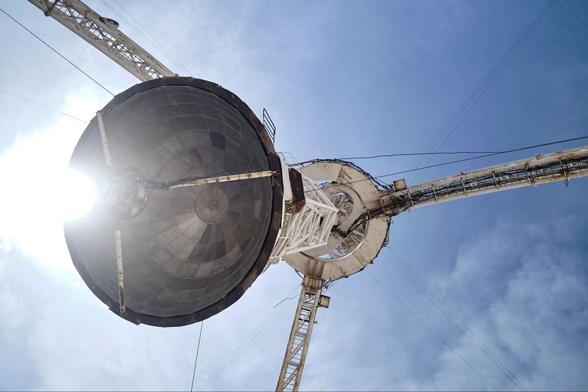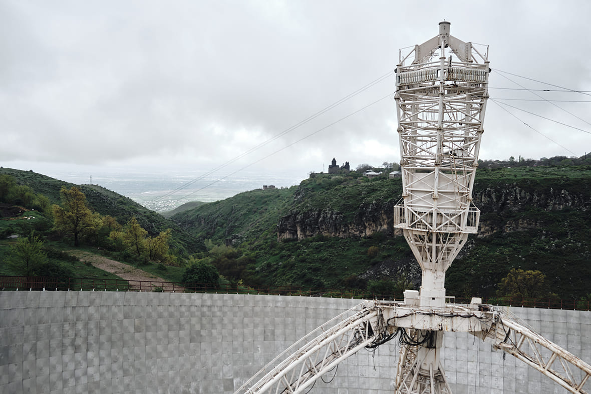 — смелое решение радиоинженера Париса Геруни, в котором он объединил оптический и радиотелескоп в одном устройстве. Этот уникальный объект построили в 1986 году. Монструозная 54-метровая сферическая тарелка из дюралюминиевого сплава с маятниковой конструкцией на трёх фермах вписана в карстовый провал, расположенный на склоне небольшого ущелья. На противоположной стороне — монастырь Тегер (Техер) постройки XIII века, а в ясную погоду можно увидеть возвышающийся над горизонтом Арарат. Интересно, что линия «Арарат — монастырь Тегер» повлияла на решение Париса Геруни строить телескоп именно в этом месте — символично.