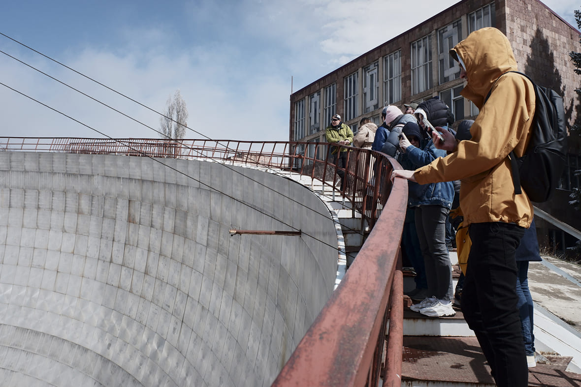 . Это гиперболическое зеркало, в фокусе которого солнечные лучи должны были, концентрируясь, вращать турбину и генерировать энергию. Но «Арев» так и остался незаконченным прототипом. Зато во дворе одного из лабораторных корпусов есть более практичное изобретение — тарелка, на которой можно готовить еду, используя энергию солнечных лучей. Похожие используют в странах Ближнего Востока. А ещё в одном из корпусов покоится старая безэховая камера — очень атмосферное место.