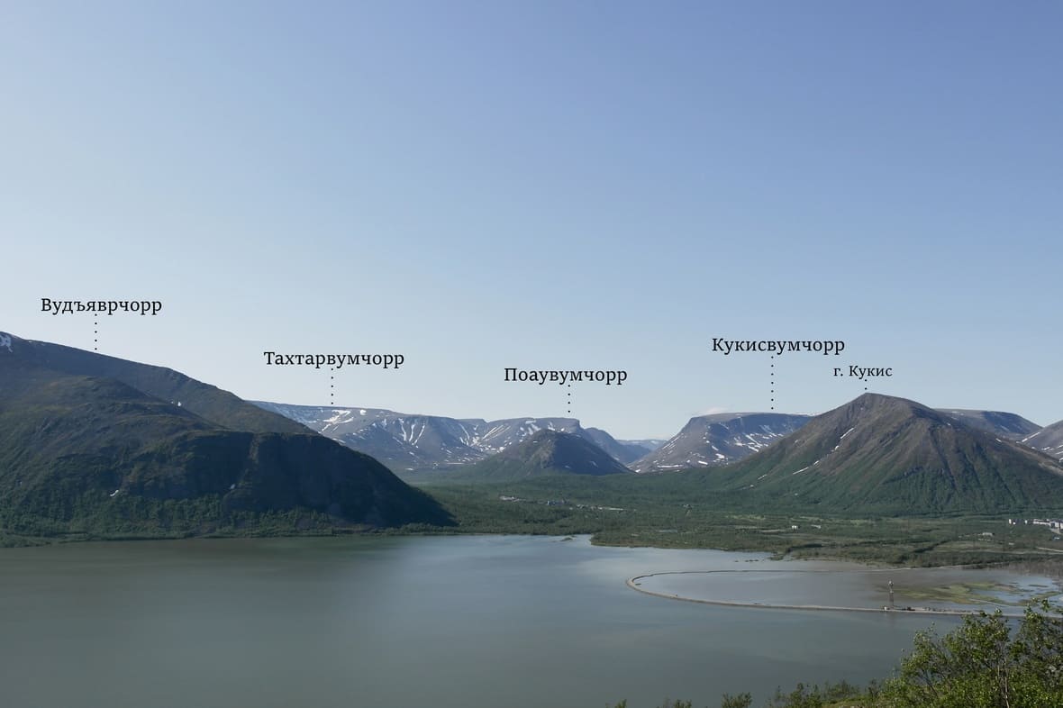 Труднопроизносимые топонимы пришли из языка саамов. Они сначала давали название реке, затем долине, а затем — горному хребту. Первая часть топонима содержит характеристику объекта. Например, длинный или скалистый, во второй части — тип объекта. Так, Вудъяврчорр означает «хребет с озером у подножия», Тахтарвумчорр — «гора у долины желанного отдыха», Кукисвумчорр — «гора у длинной долины», где кукис — «длинный, долгий».