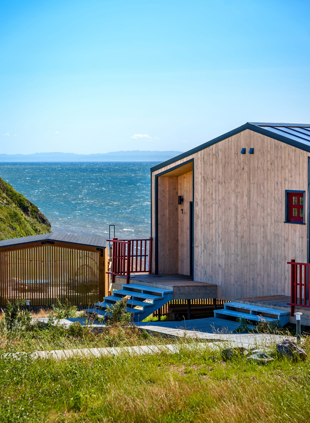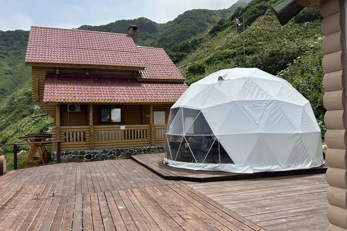 - Глэмпинг «Мечты у моря» — уютное место на берегу. Можно выбрать барнхаус или геокупол. В некоторых барнхаусах есть банный чан, чтобы погреться с видом на Анивский залив. Поесть можно в ресторане с авторской кухней. Находится по дороге на мыс Анива и в лагуну Буссе.