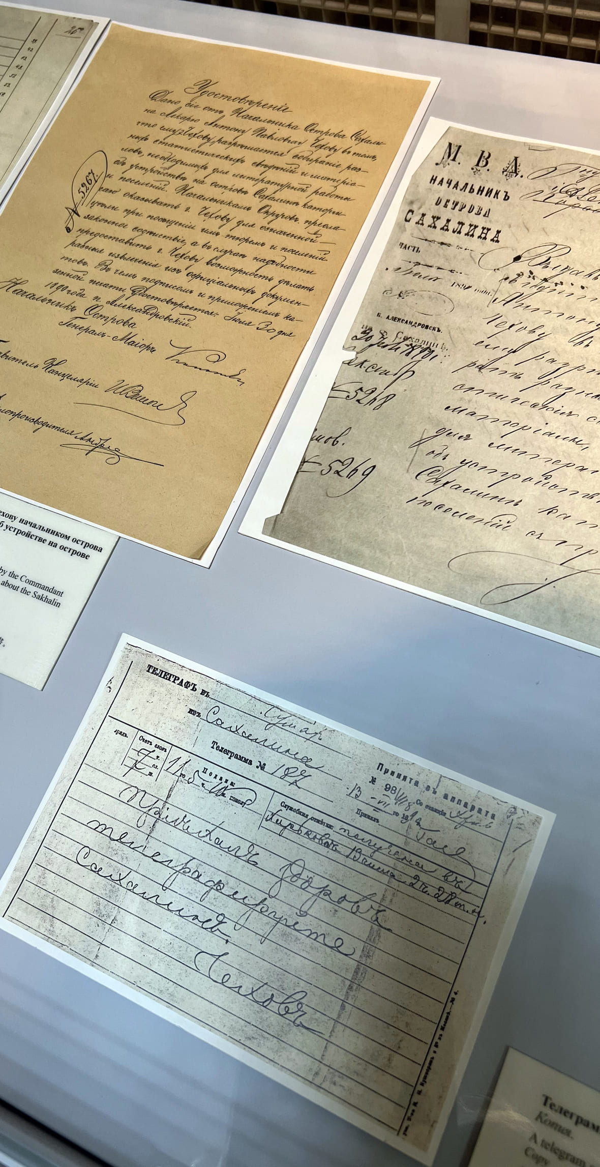 Копии документов, телеграмм и удостоверения Чехова. Фото: Ольга Шамшуварова