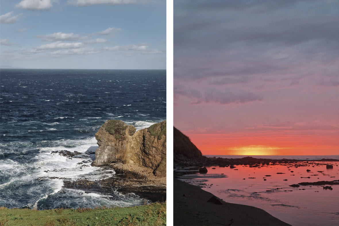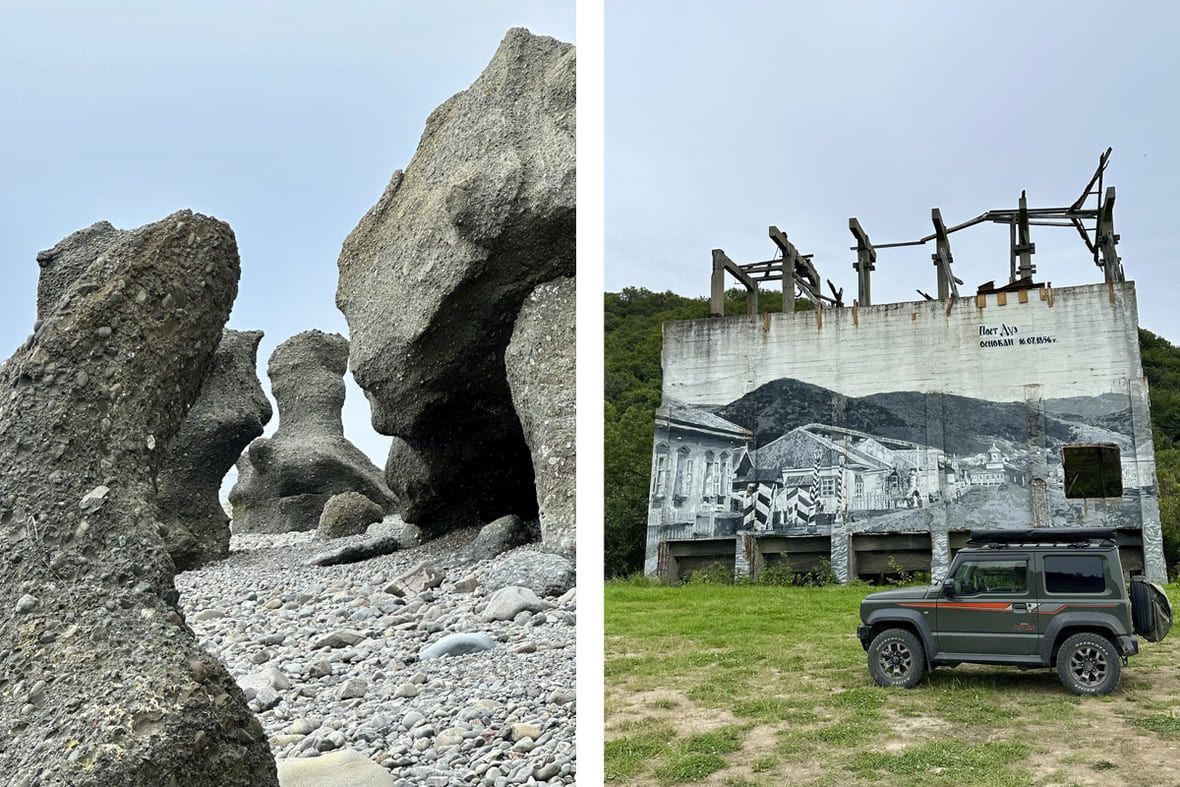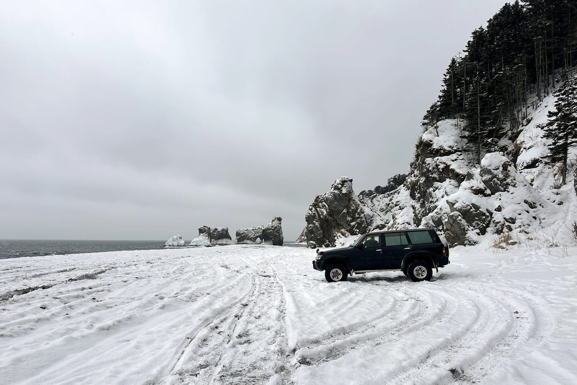 Как добраться: летом, весной и осенью — на внедорожнике, зимой — на снегоходе. По асфальтированной дороге из Южно-Сахалинска до села Охотского, где можно пройти по набережной залива Мордвинова и купить в магазине чай, кофе и выпечку. Дальше — по грунтовой дороге и широкому пляжу, где встретите милых лошадей-попрошаек. Потом начинается бездорожье, по нему придётся трястись до мысов. Обратно мне нравится возвращаться по другой дороге — делать кольцо через озеро Буссе.