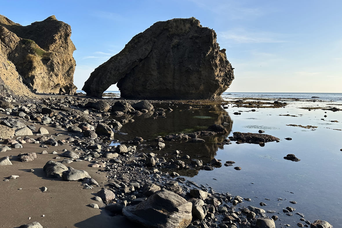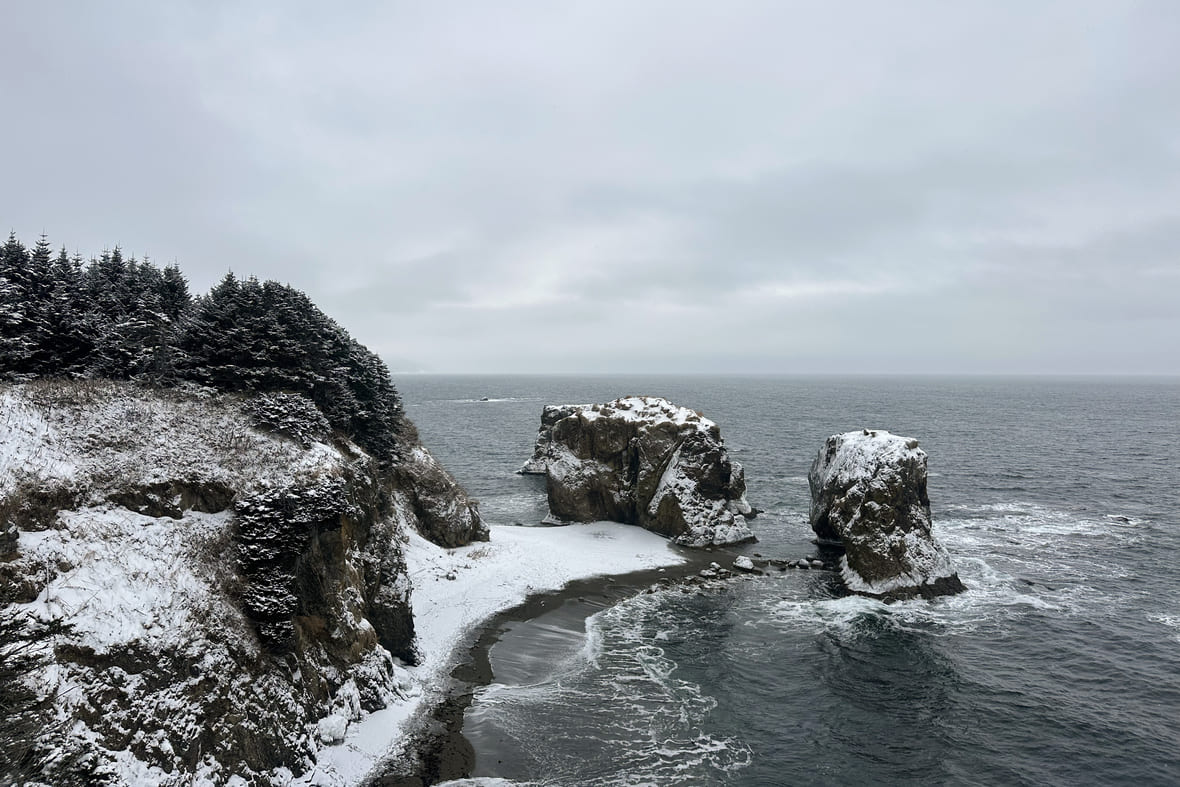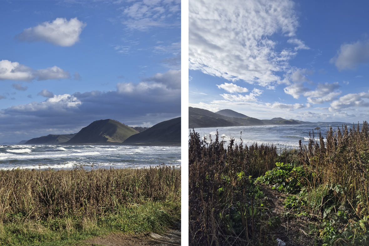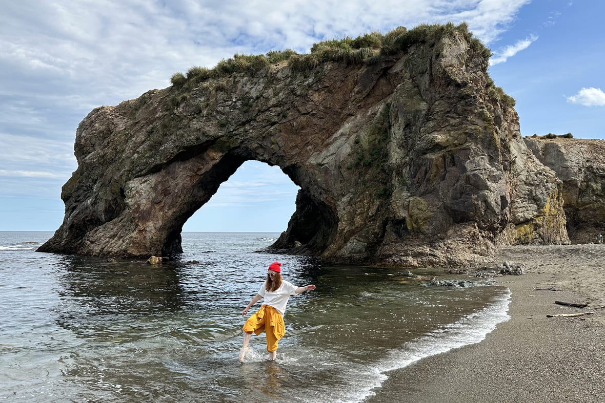 Как добраться: летом, весной и осенью — на внедорожнике, зимой — на снегоходе. По асфальтированной дороге из Южно-Сахалинска до села Охотского, где можно пройти по набережной залива Мордвинова и купить в магазине чай, кофе и выпечку. Дальше — по грунтовой дороге и широкому пляжу, где встретите милых лошадей-попрошаек. Потом начинается бездорожье, по нему придётся трястись до мысов. Обратно мне нравится возвращаться по другой дороге — делать кольцо через озеро Буссе.