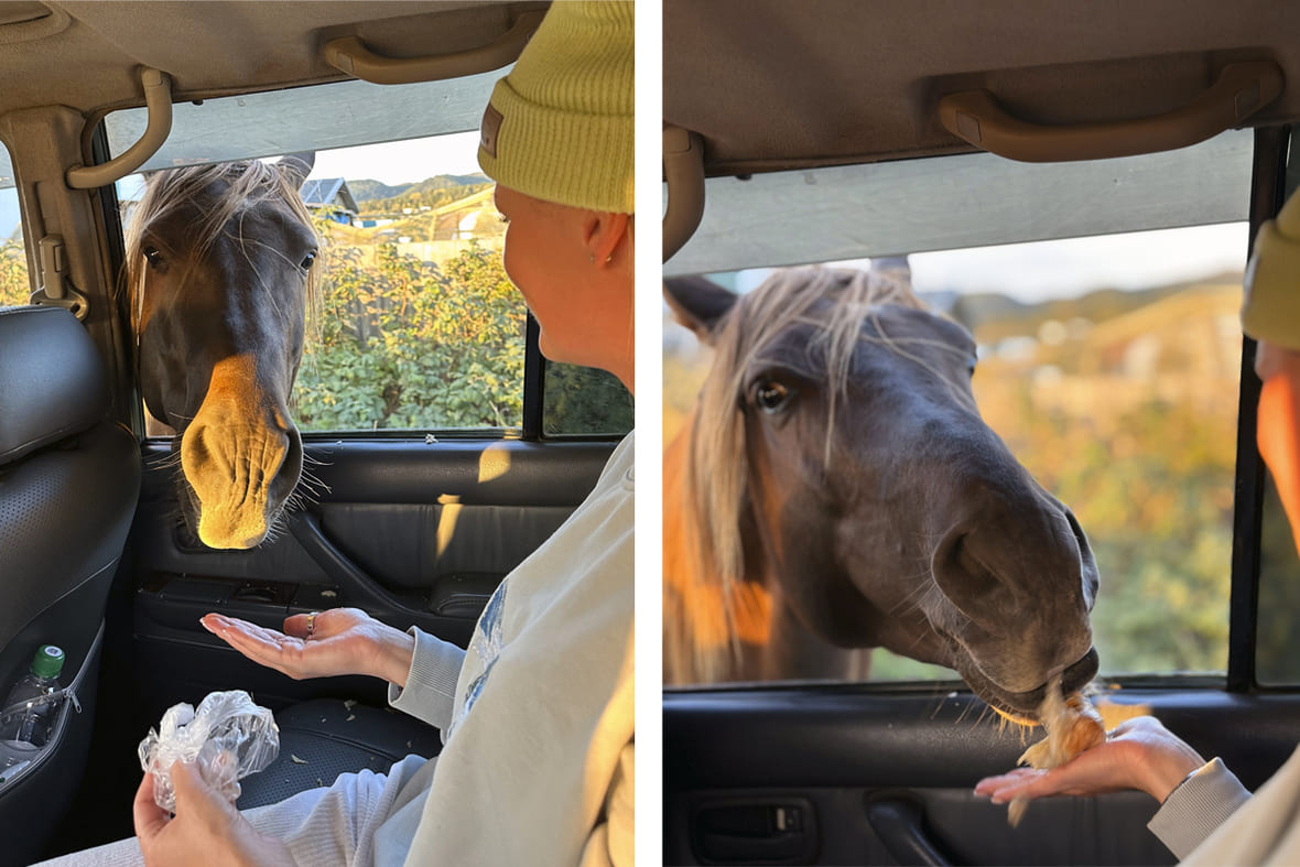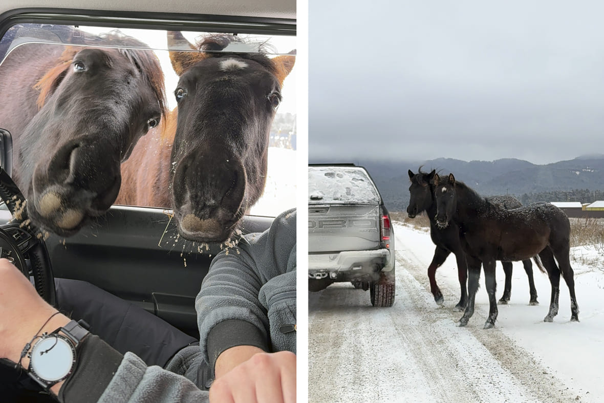 Лошади-попрошайки не боятся людей и просовывают мохнатые морды в окна автомобилей. Фото: Ксения Титова