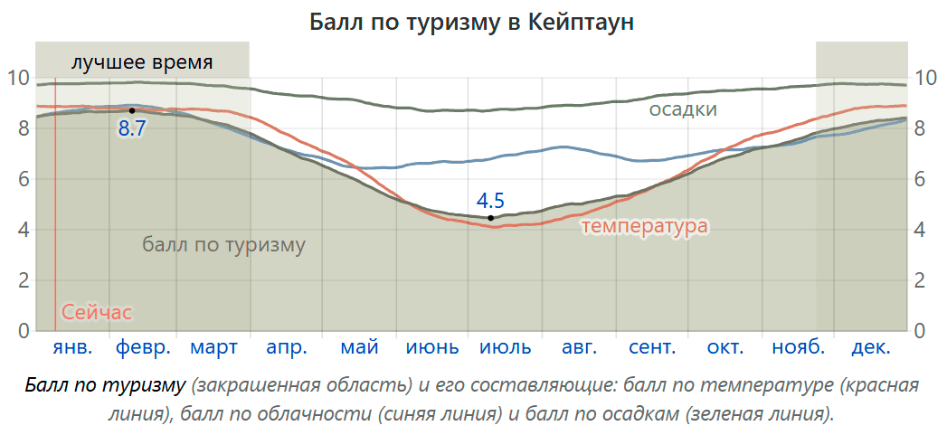 Сервис Weatherspark.com исследовал архивные данные погоды в Кейптауне — температуру, количество осадков и ясных дней — и по ним подсчитал «балл по туризму». Чем он выше, тем комфортнее условия для путешествия по городу и окрестностям. На графике видно (тёмная область), что по погодным условиям лучшее время для поездки — с ноября по апрель. Источник: