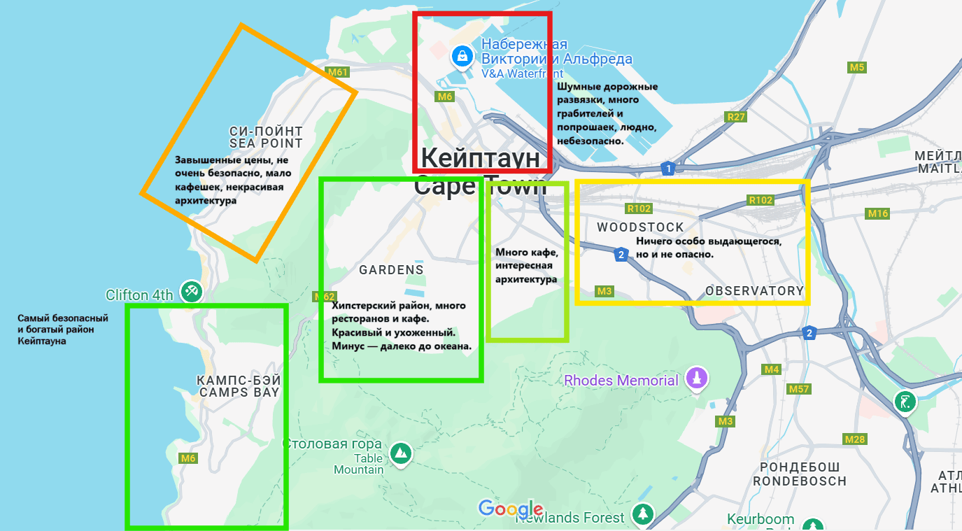 Карта Кейптауна с описанием основных районов. Местные жители благосклонно относятся к туристам, но бывают и исключения. Карту подготовила Диана Добродий