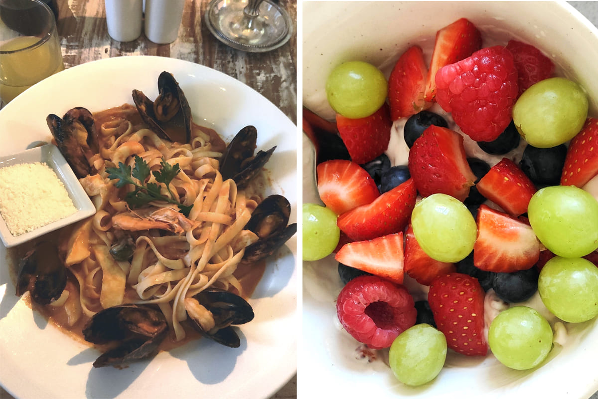 Паста с морепродуктами на обед и сезонные ягоды с йогуртом на завтрак. Фото: Диана Добродий