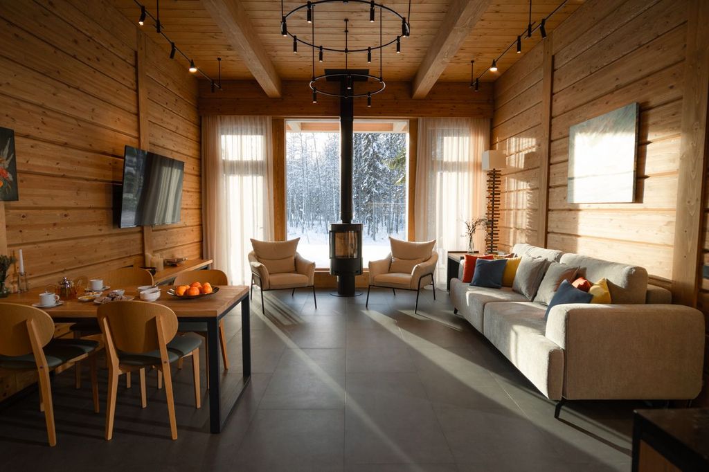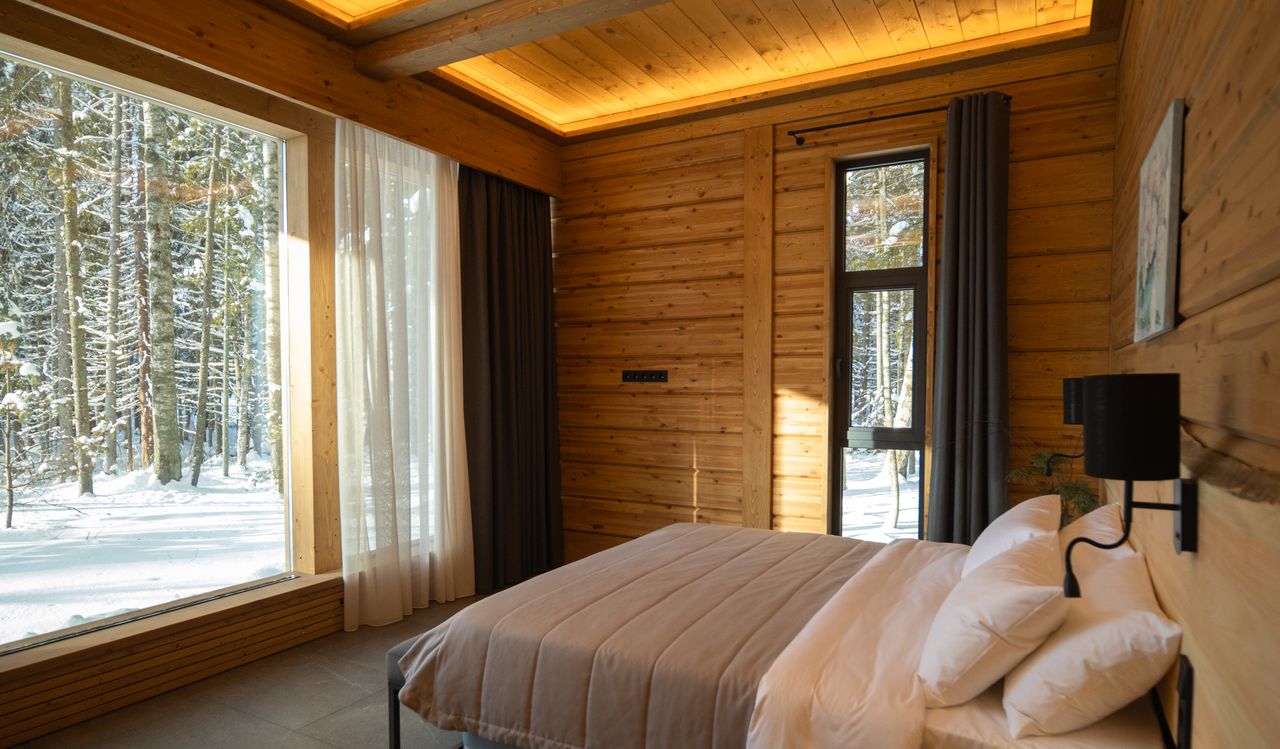 В каждом коттедже — тёплые полы, сушильный шкаф для одежды, оптоволоконный интернет. Винный шкаф, коллекция чаев, холодильник с гастрономическим сетом от шеф-повара из продуктов с нашей фермы.