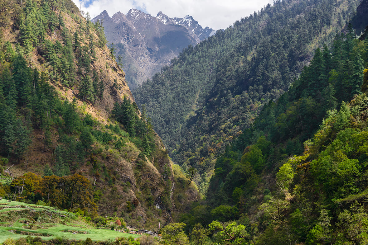 Высоты в долине умеренные по гималайским меркам. Основные деревни расположены между 1900 и 3100 метрами, верхняя точка трека — монастырь Му-Гомпа на высоте 3700 метров. Рельеф при этом типично гималайский. Нижняя часть пути проходит через глубокие лесистые ущелья с подвесными мостами и каменными ступенями. Выше долина раскрывается: появляются террасные поля, каменные дома с дворами, обращёнными к утреннему солнцу, и засушливые высокогорные ландшафты, напоминающие Тибетское нагорье.