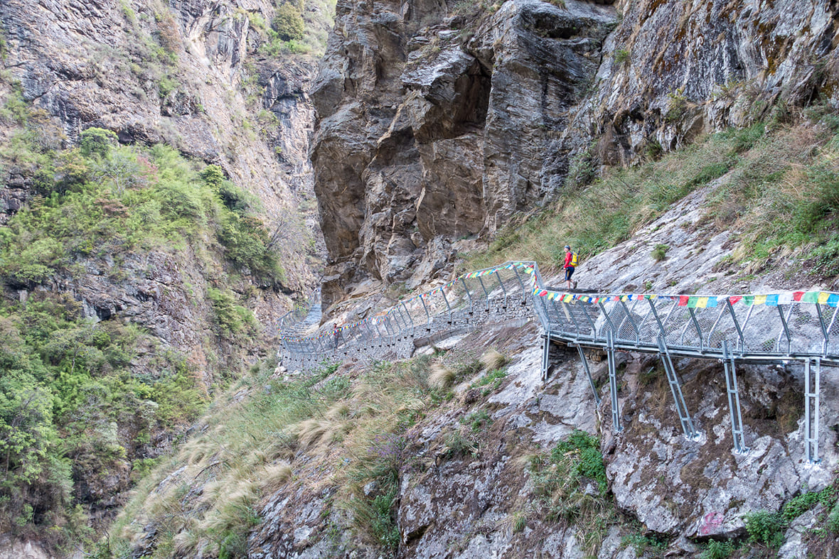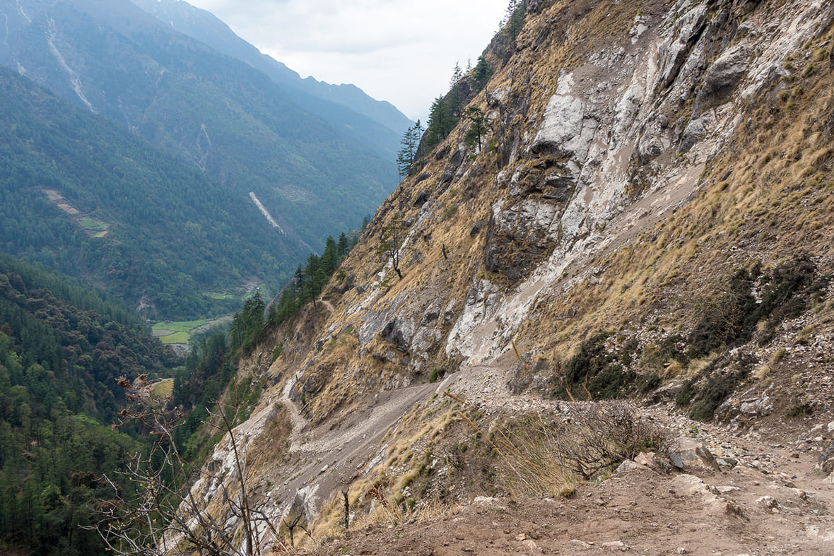 От развилки с маршрутом вокруг Манаслу тропа входит в узкое ущелье реки Сияр-Кхола. Здесь густой лес, подвесные мосты, каменные ступени, металлические дорожки над обрывами. Впечатление от пейзажей сильное: отвесные скалы, водопады на склонах Шринги-Химала, грифы над каньоном. Старайтесь не засматриваться на красоту и смотрите под ноги. Участки тропы сыпучие и местами размытые.