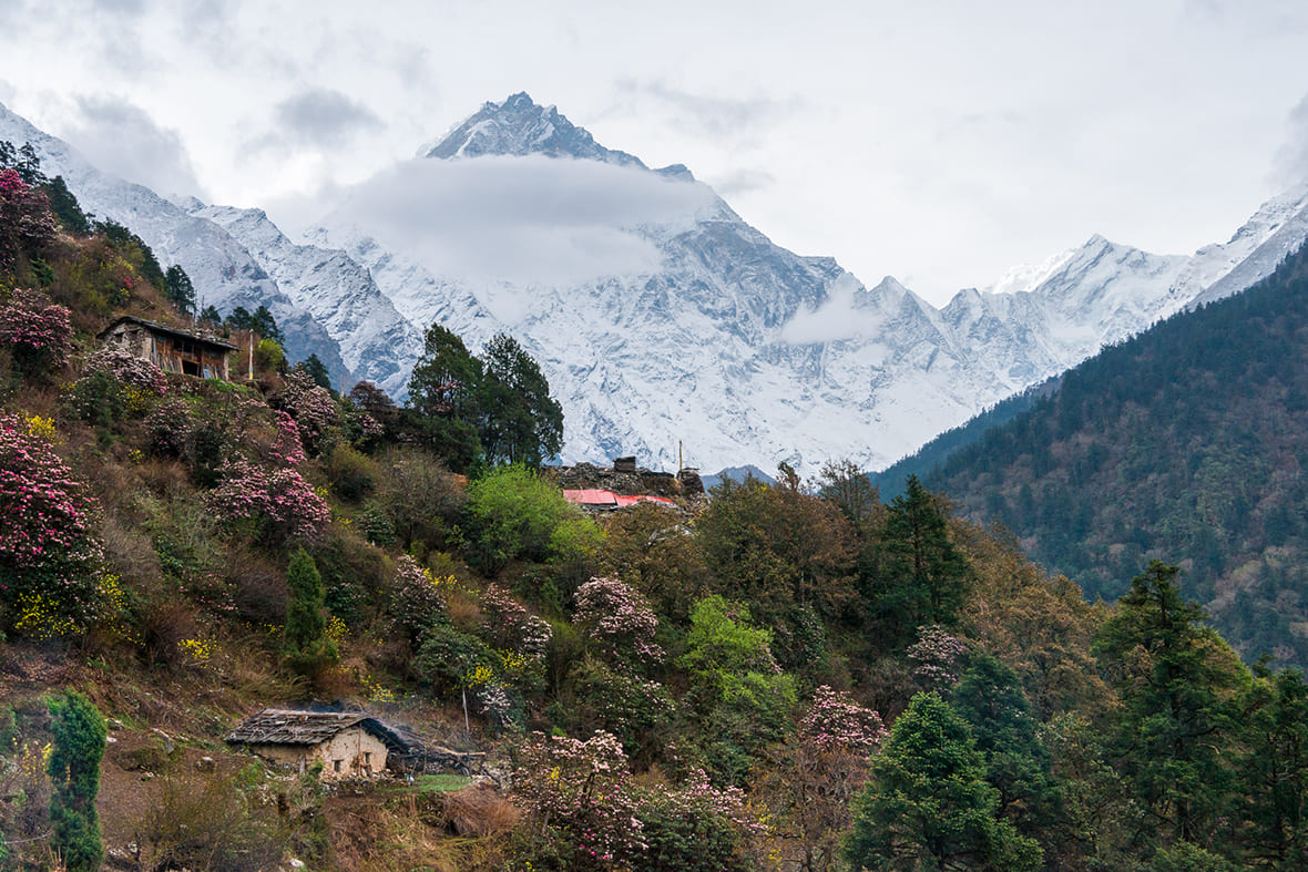 Март–апрель — второе длительное погодное окно. Дневные весенние температуры сопоставимы с осенними, но перепад между днем и ночью более резкий. Перевалов нет, поэтому снеговая обстановка не влияет на проходимость. В нижней и средней части маршрута — на высотах от 1500 до 3000 метров цветут рододендроны и добавляют маршруту красок, которых нет осенью.