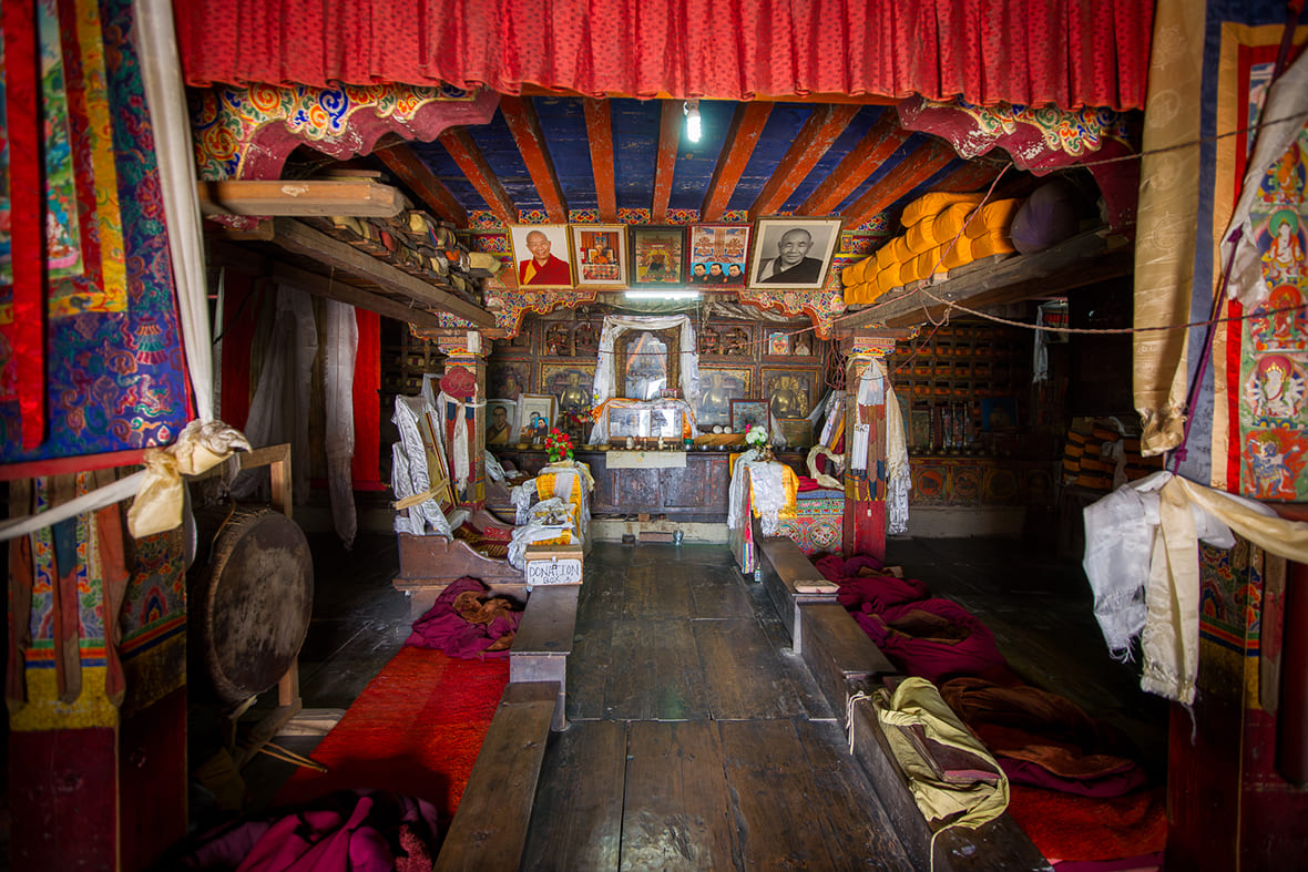 Несколько комнат при монастыре — простые матрасы, минимальные удобства. Условия аскетичные, но ночёвка здесь — часть опыта: утренняя пуджа, тишина, виды на Ганеш-Химал с высоты 3700 метров.