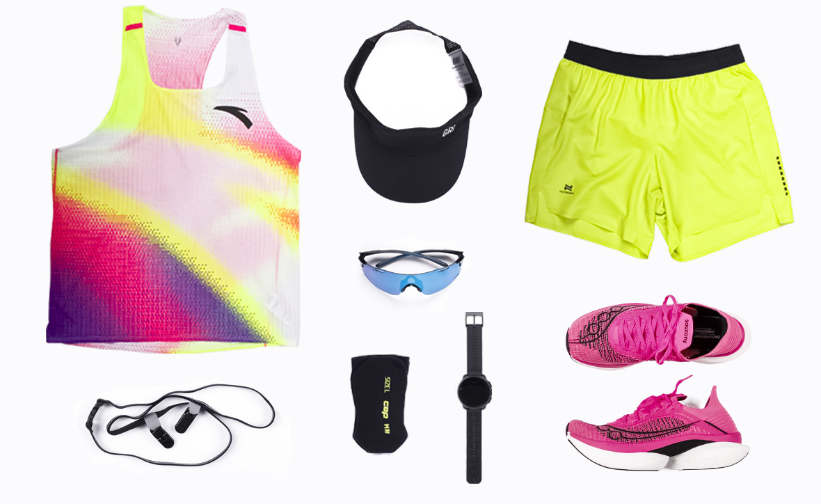 Официальный старт — место для проверки собственных сил, возможность показать себя и посоревноваться с другими. Здесь во главе угла стоят скорость и эффективность. Поэтому наш «парадный» стартовый комплект одежды именно такой: он рассчитан на быстрого бегуна, нацеленного на личный рекорд в очередном забеге. Палитра цветов намеренно яркая, чтобы быть заметнее для болельщиков и на фото. За основу для сета мы взяли кроссовки Saucony Endorphin Elite — одну из лучших моделей с карбоном на рынке.